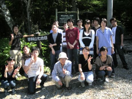 7合目(鳥居の前)で記念写真。ちょっと疲れたメンバーがいますねw